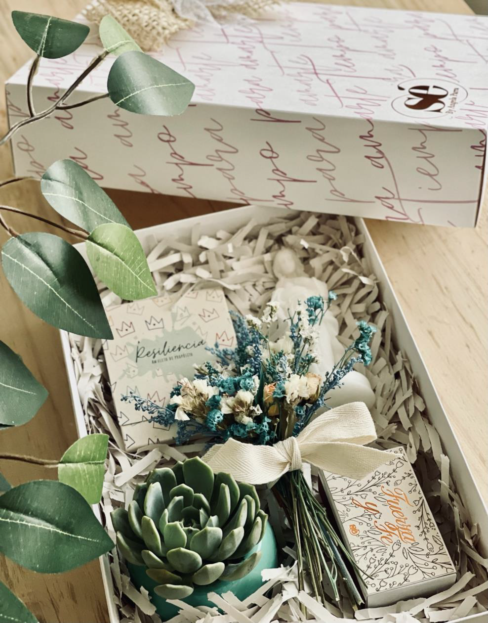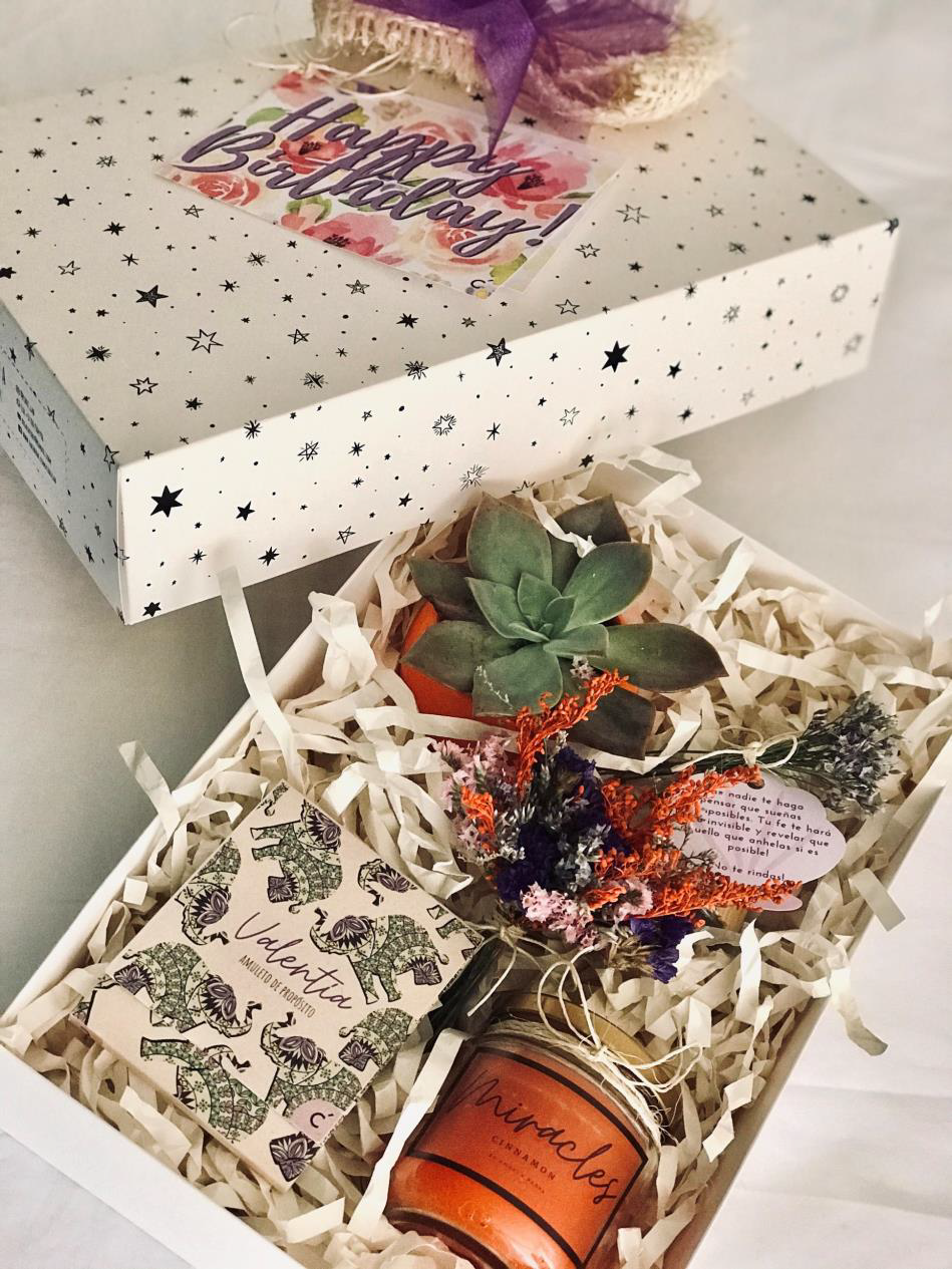 Contiene: amuleto, vela, planta, fósforos, caja mediana, moño y tarjeta a elección.