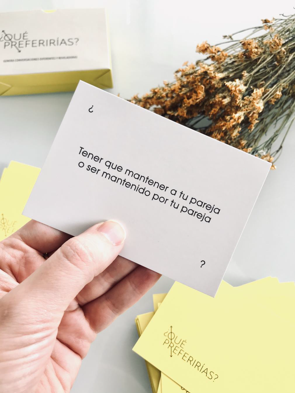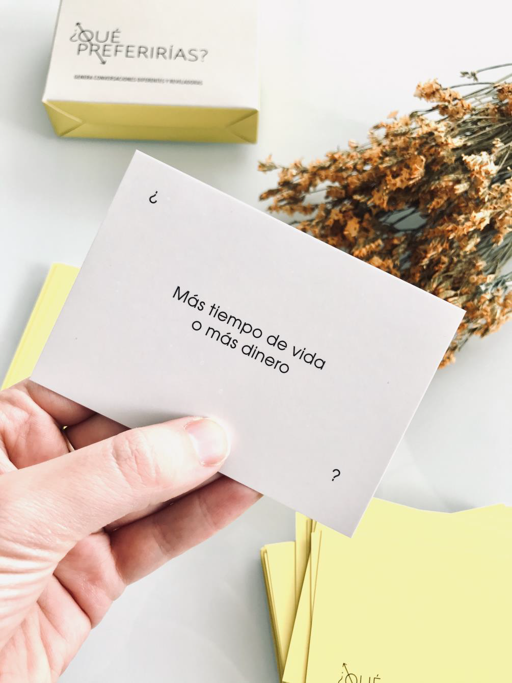 Deck de 70 cartas con preguntas de opuestos para generar conversaciones diferentes.