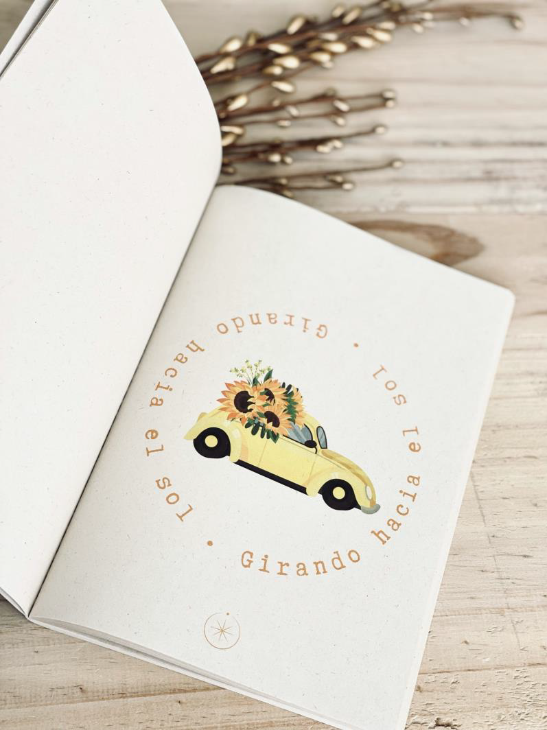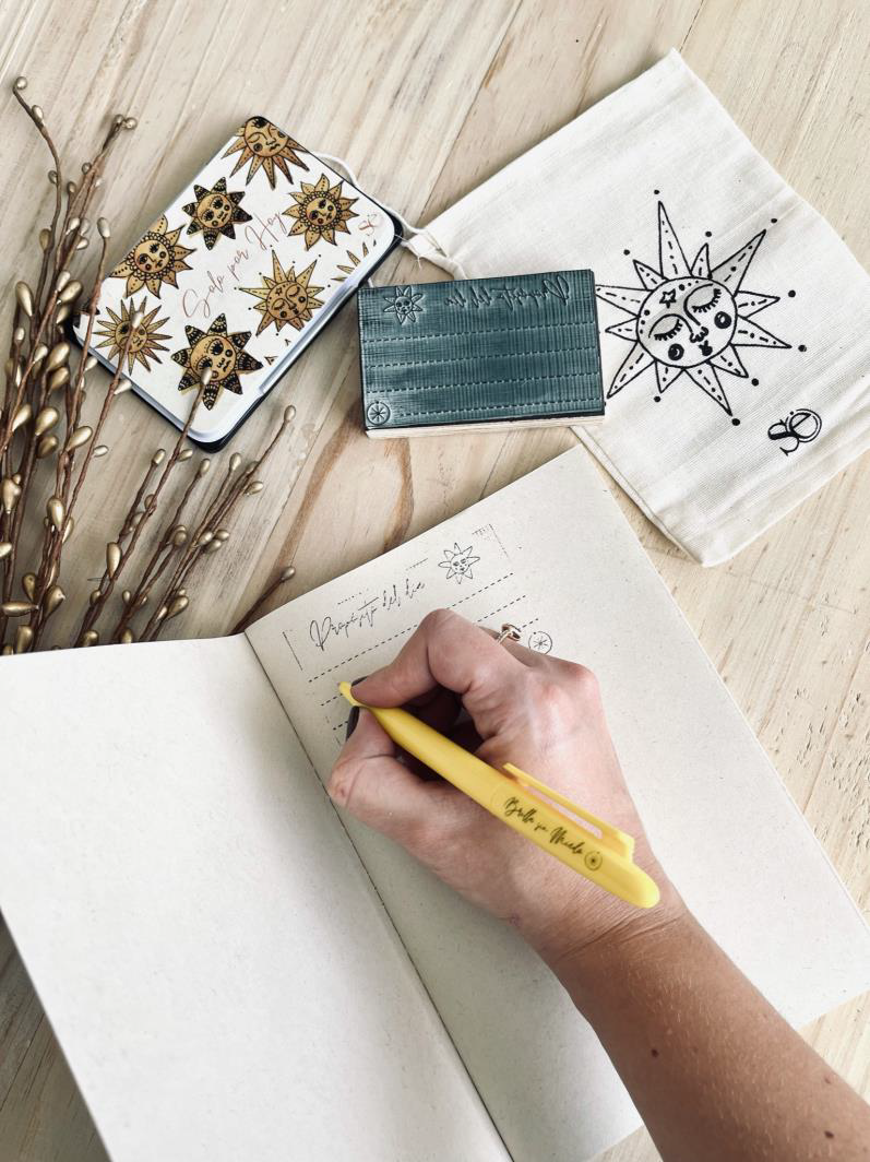 Libreta en papel ecológico con diferentes mensajes y espacios para escribir tus propósitos diarios, sello “propósito del día”, almohadilla de tinta negra, esfero,