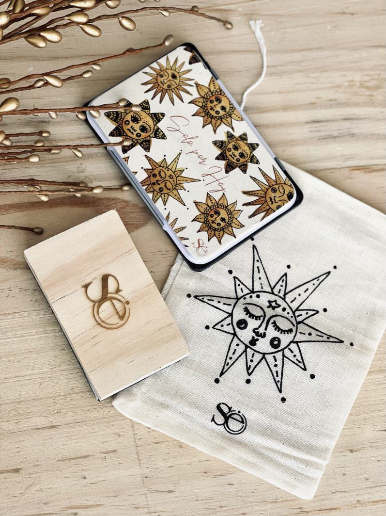 amuleto (pulserita) de sol como anclaje para que te recuerde escribir, tulita estampada, mini ramo, caja, moño y tarjeta.