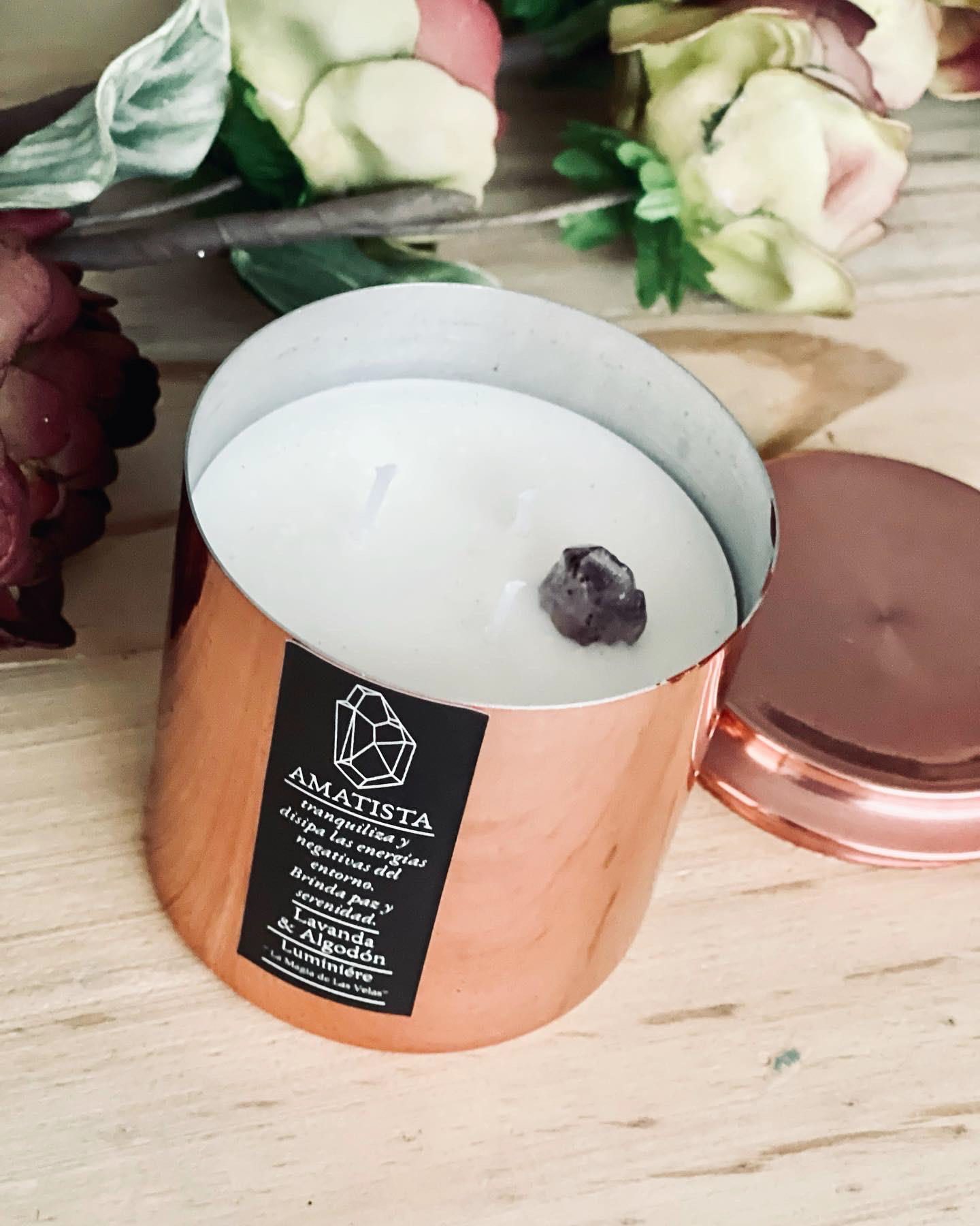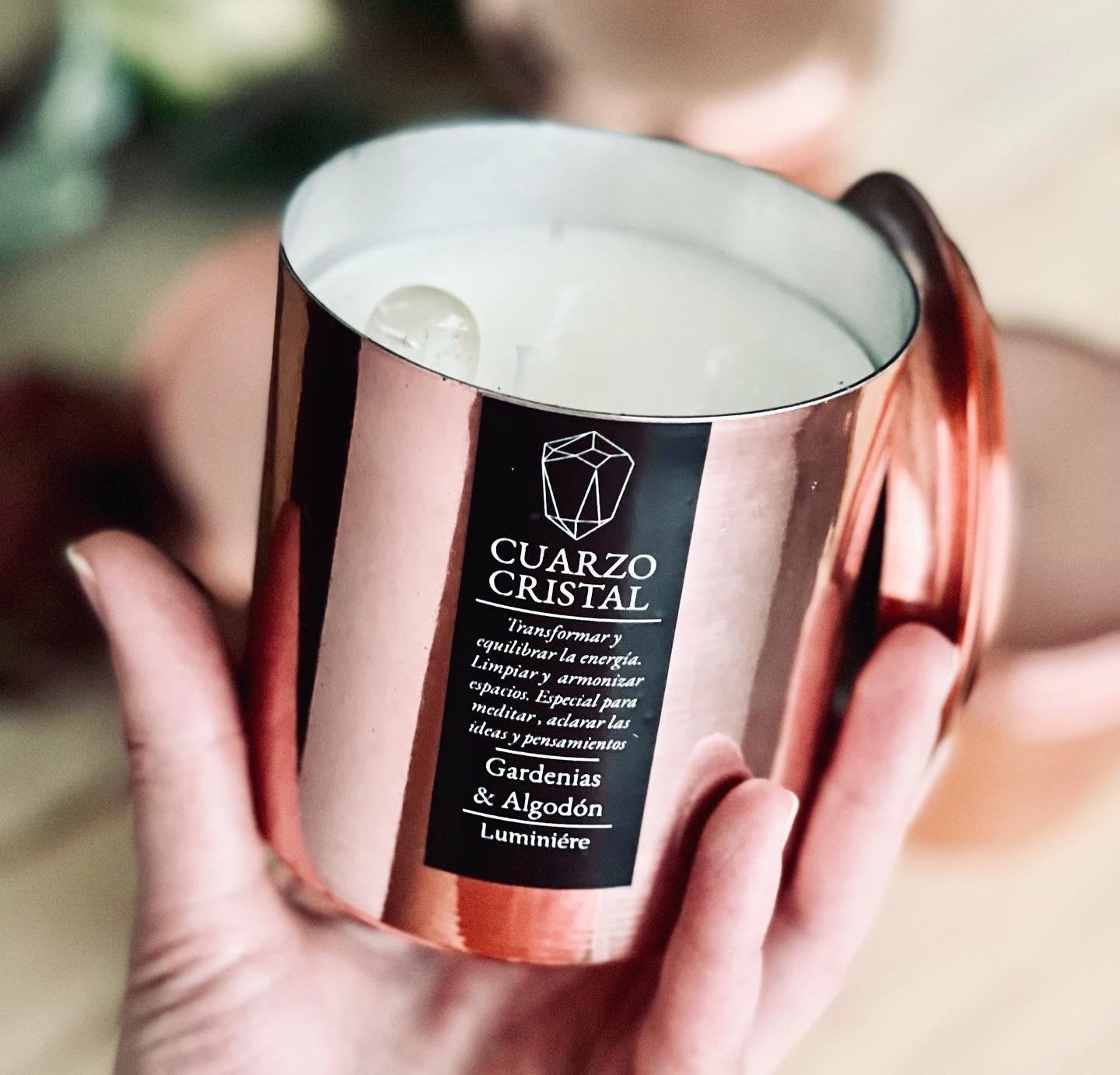 Vela de 300gr en aluminio oro rosa 7,5cm x 9 cm con cristales, en cera vegetal y pabilos de algodón.