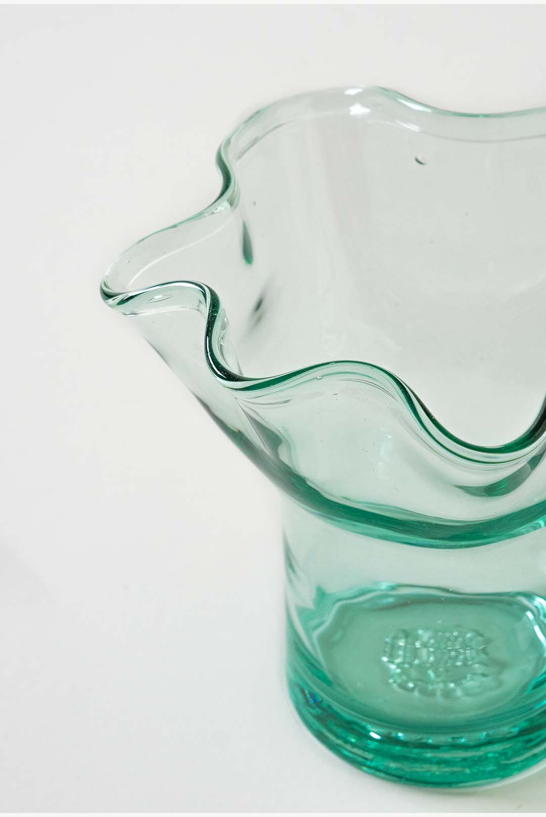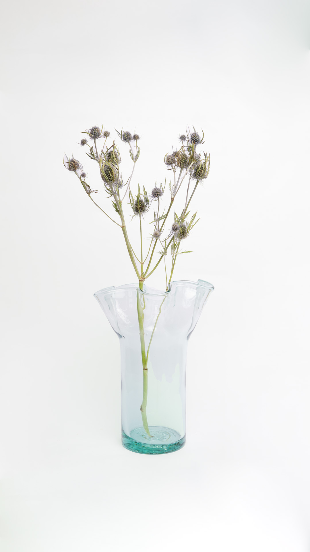 Donaire es un florero alto de boca ancha perfecto para arreglos florales u hojas. Hecho a mano y fabricado en vidrio 100% reciclado. Cada pieza es única, podrá variar sutilmente su forma y color.