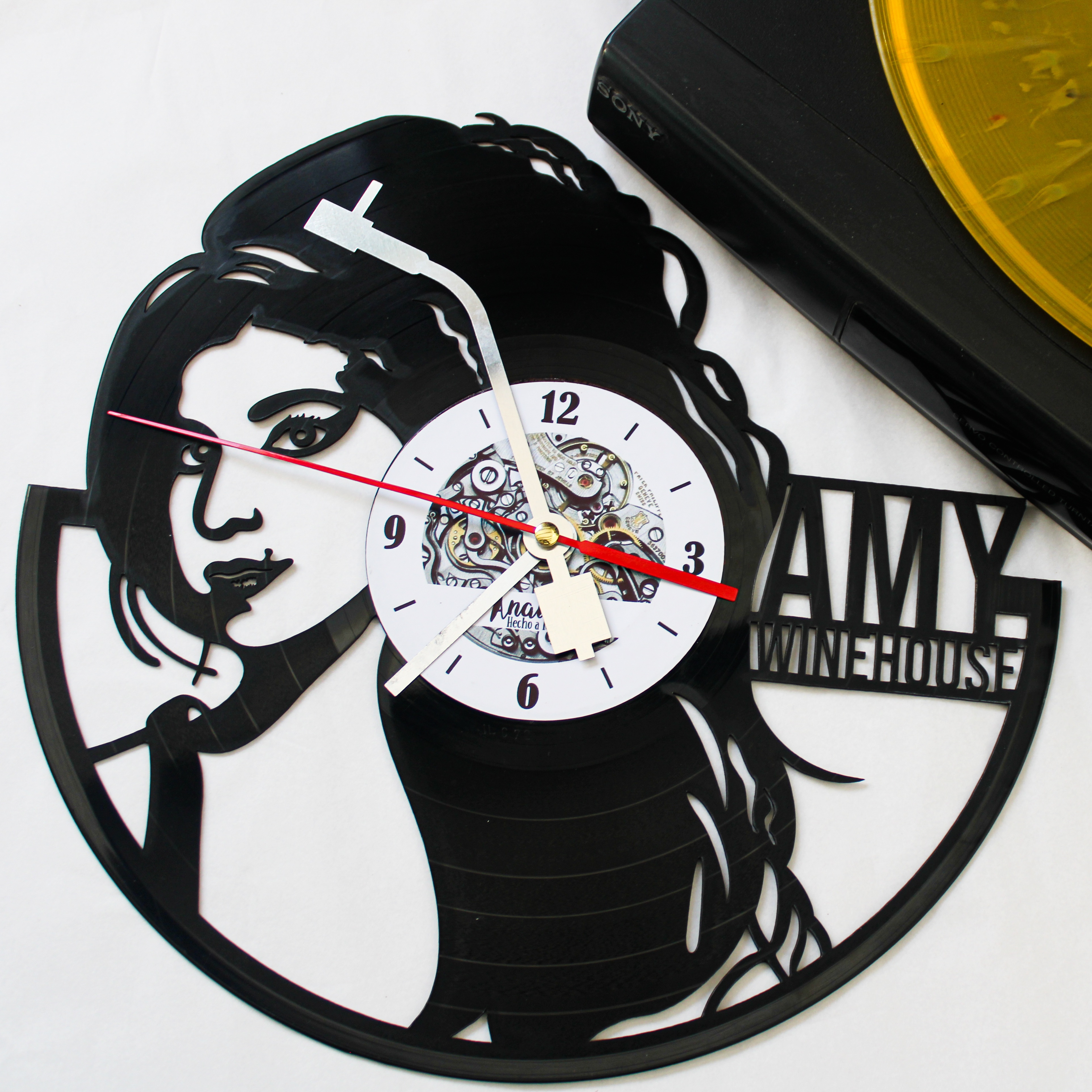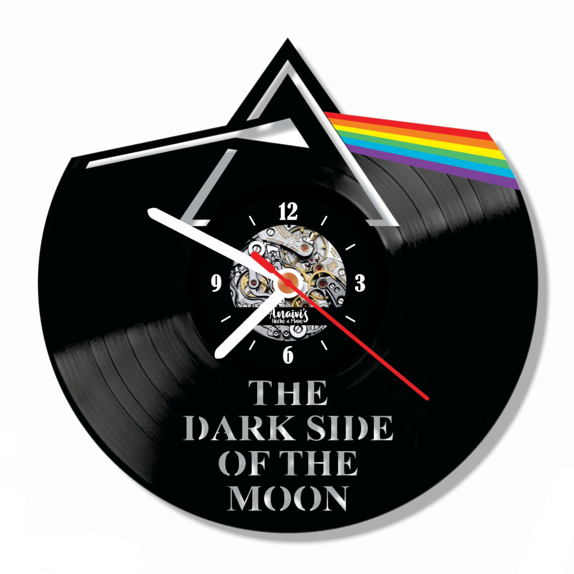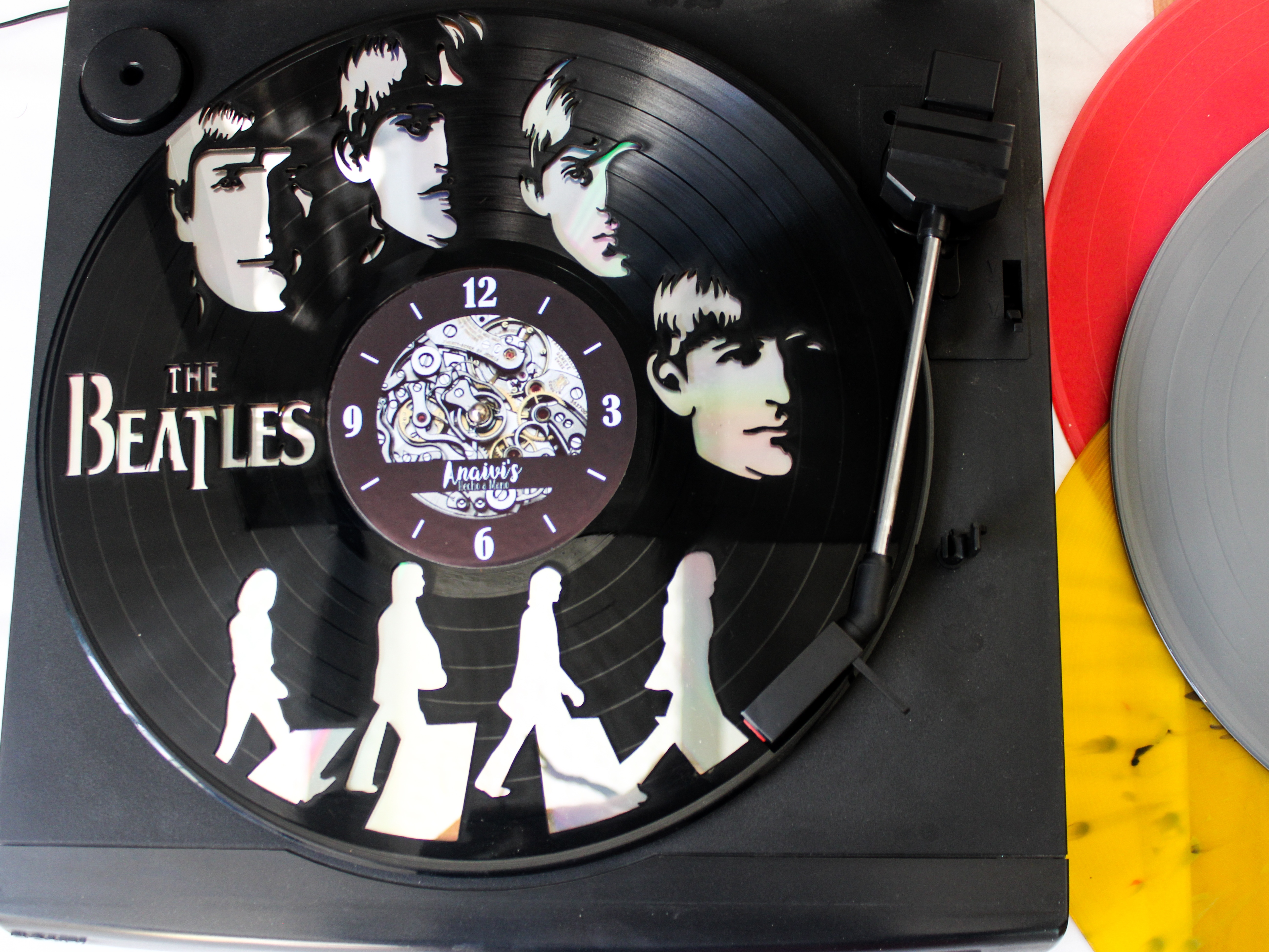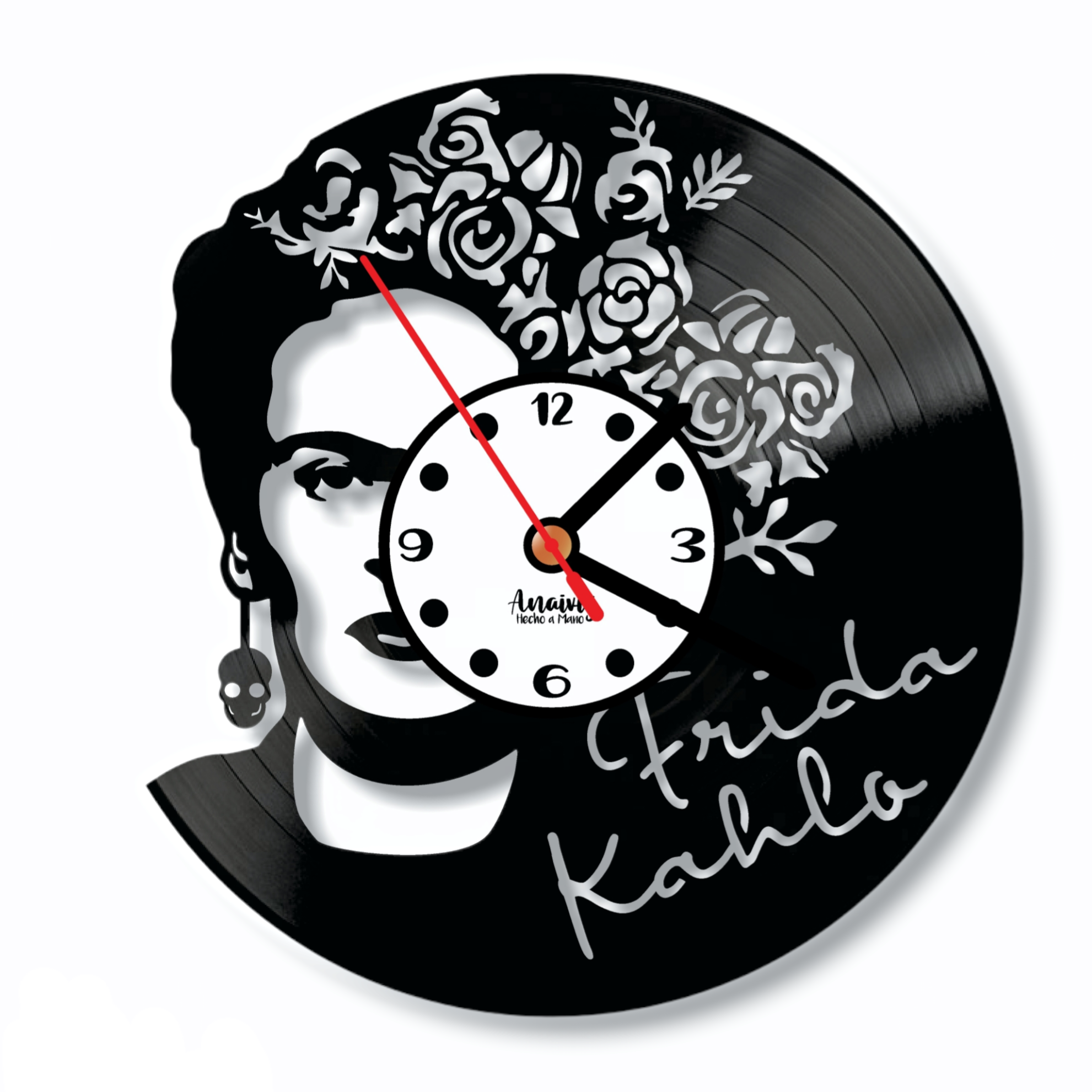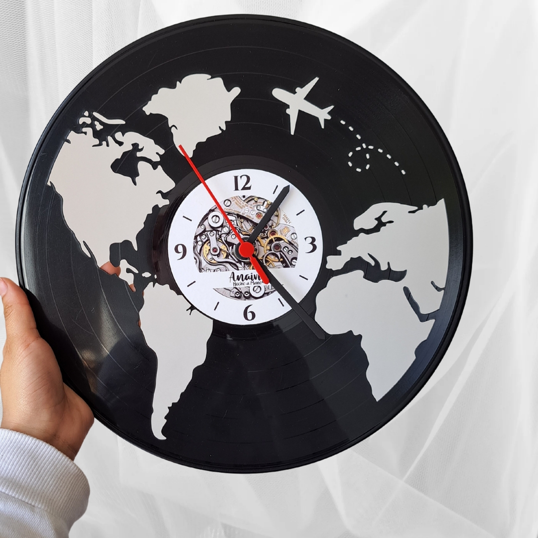 Reloj para pared fabricado en un disco de vinilo (long play), el cual ha sido reutilizado y transformado para crear una pieza exclusiva.