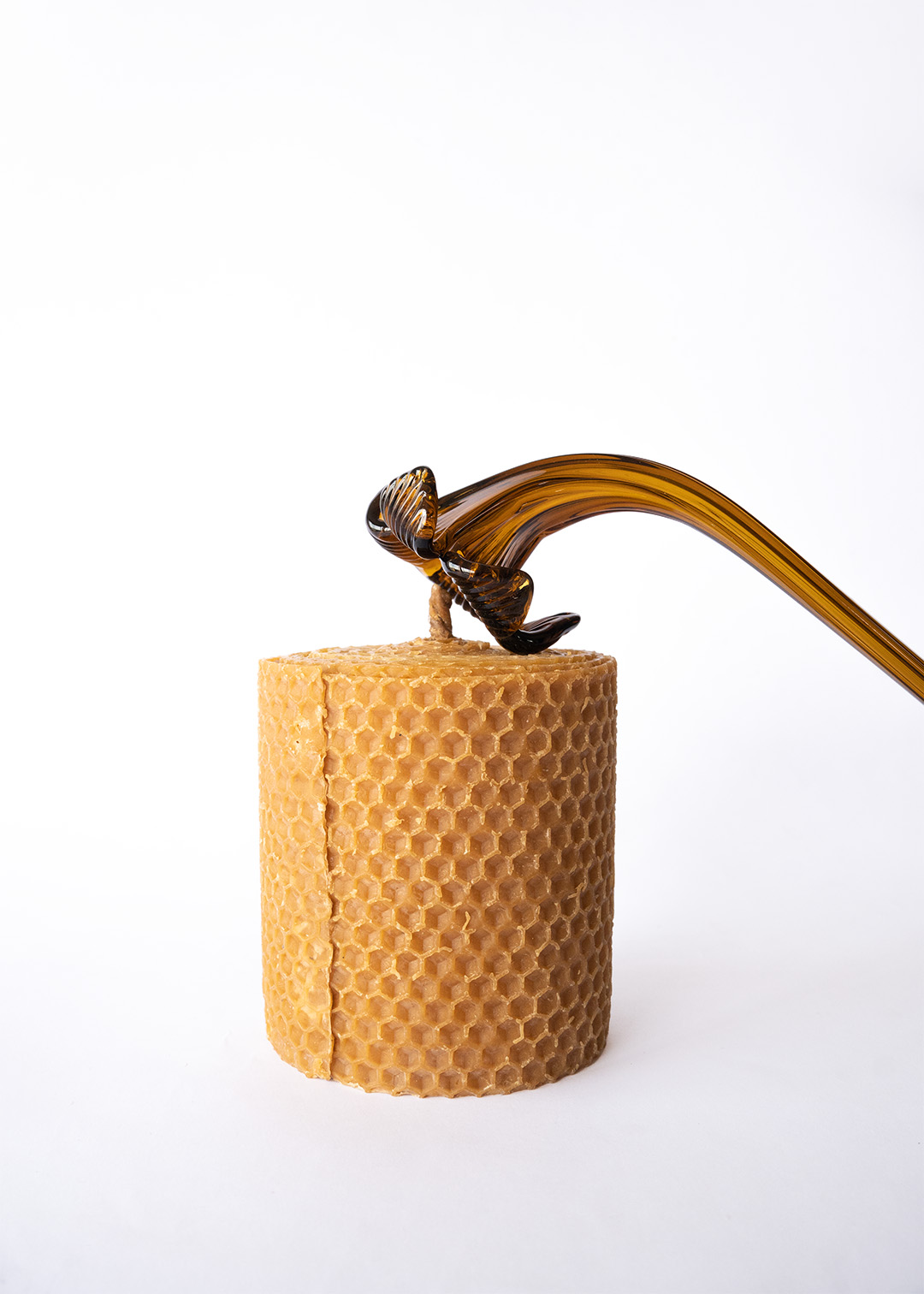 Set de velón en cera de abeja + apagavelas ámbar en vidrio soplado