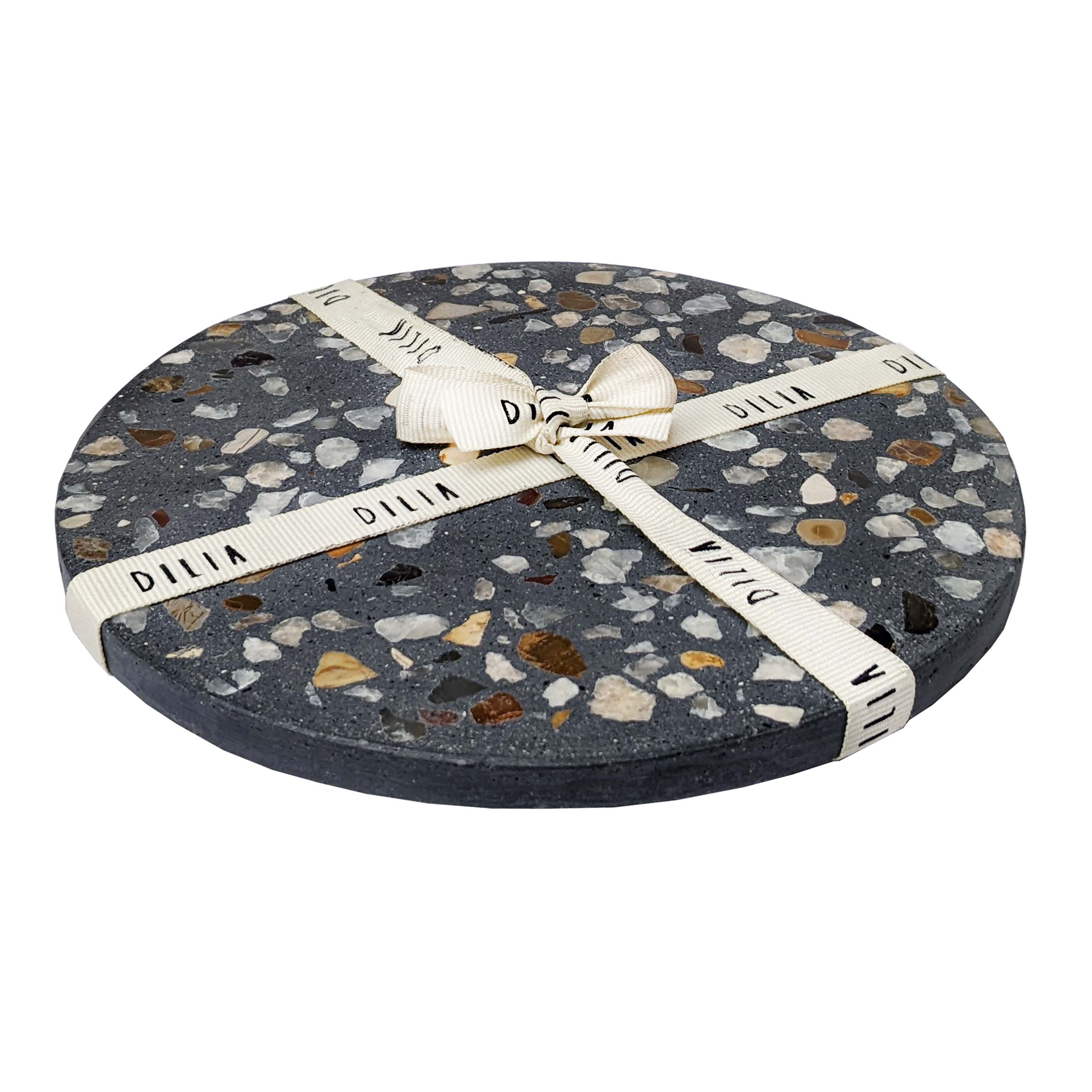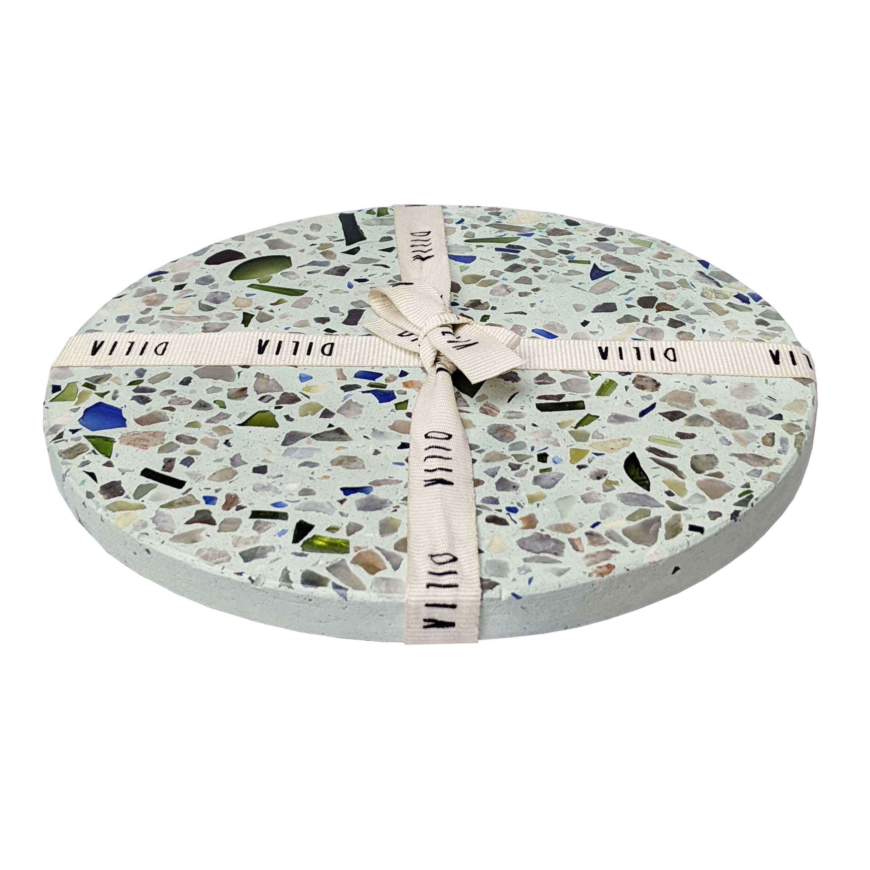 Porta caliente de 17 cm x 1.5 cm de alto, hecho en terrazzo con diferentes piedras naturales y materiales reciclados.