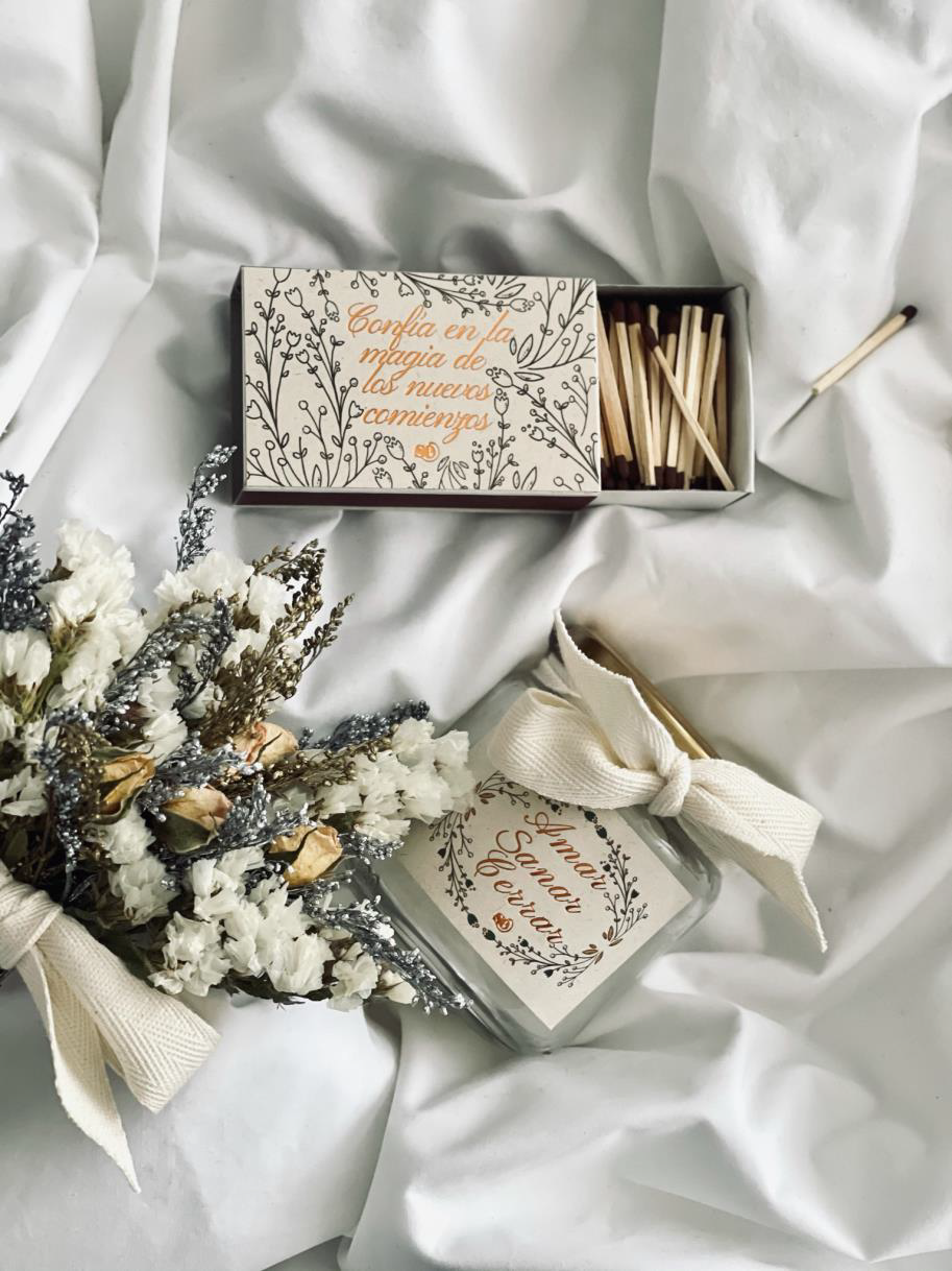 Contiene: libro, esfero, vela, fósforos, mini ramo, 3
