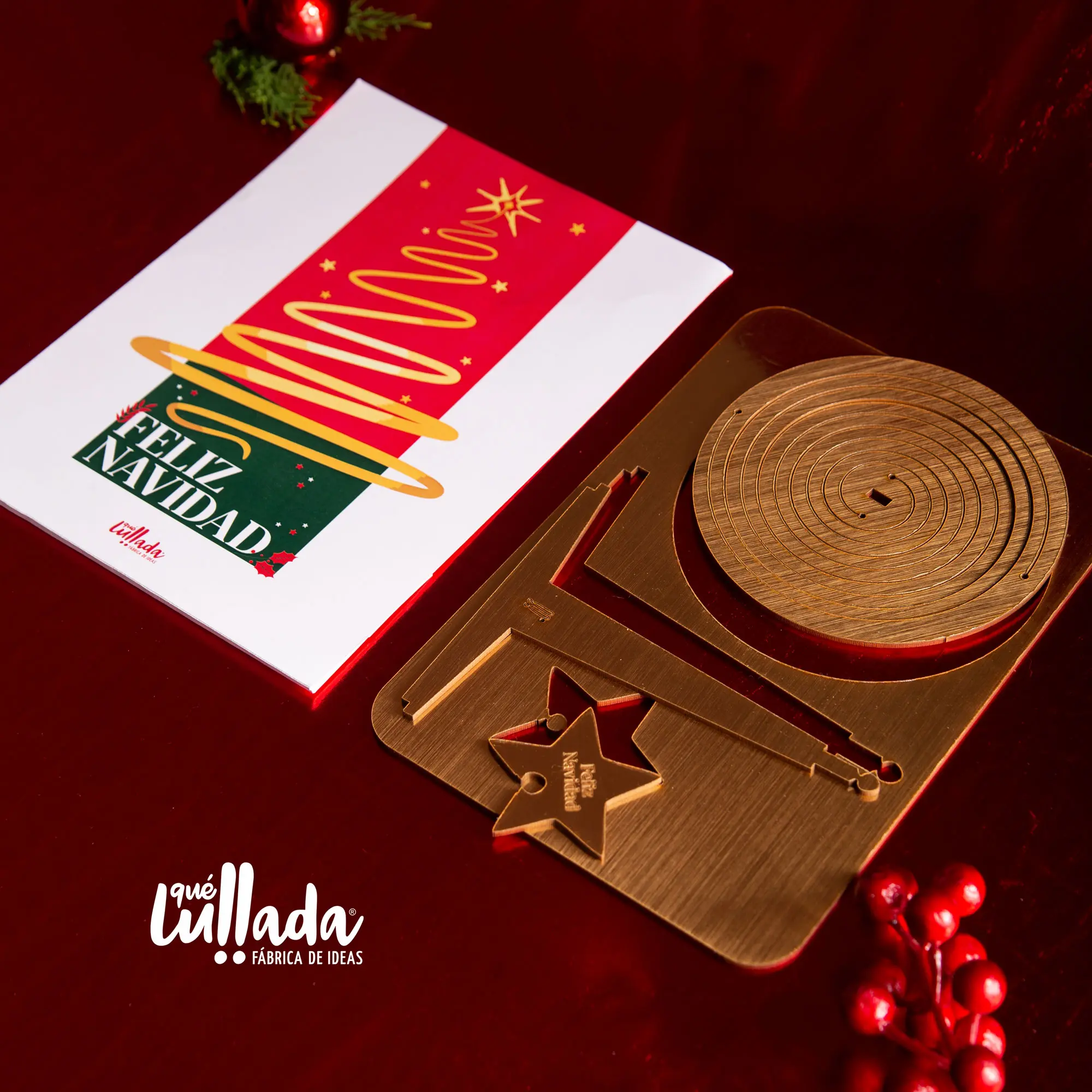 Lleva la Navidad y los buenos deseos a cada rincón favorito con este Árbol de Navidad Espiral, está elaborado en madera metalizada, color dorado y brilla! Perfecto para colocar cerca a un escritorio o mesa, llenando cada rincón con el espítiru navideño y coronado en la estrella el nombre, palabra o deseo a quien quieras regalar. Este Árbol de Navidad Espiral, tiene una altura de 20 cm de alto armado, se entrega dentro de un estuche con las instrucciones listas para armar y luego guardar. Puedes personalizar la estrella con el nombre, palabra o frase que desees.
