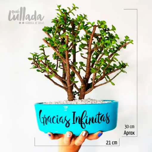 Las medidas del bonsái son: 21 cm de base y 30 cm aproximadamente de altura, la cual puede variar de acuerdo a la especie y su naturaleza.