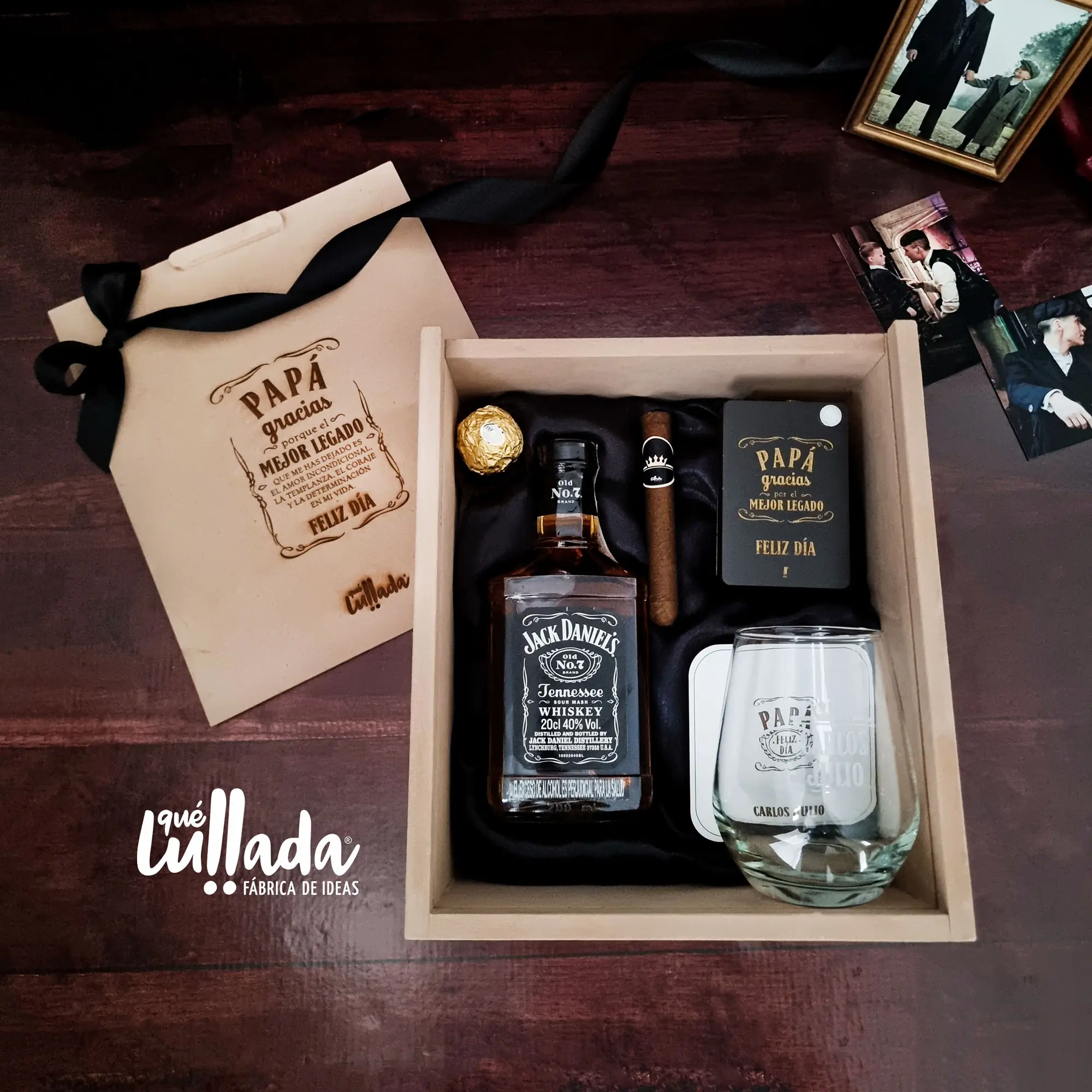 Esta caja de regalo para papá es un regalo muy especial, ya que contiene los elementos seleccionados para hacerlo sentir tan importante y exclusivo, como el amor que te da. Este producto contiene: * Un botella de Jack Daniel’s de 200ml * Un Porta Pocket * Un vaso de cristal personalizado * Un portavasos personalizado. * Un “tabaco” que es un tubo relleno de: maní o dulces (eliges solo una opción). * Un Ferrero Rocher Empacado dentro de una caja de madera decorada y que puedes personalizar. El color de la caja de madera puede ser un tono más oscuro al que tiene la foto de referencia. Este producto será comercializado únicamente a mayores de edad. El exceso de alcohol es perjudicial para la salud.