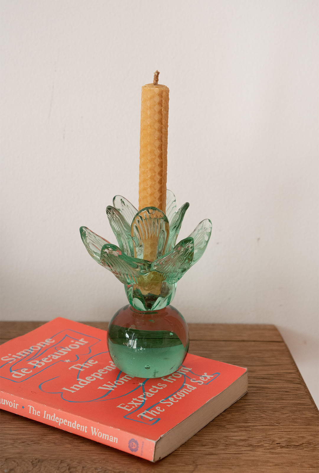 Hecho a mano y fabricado en vidrio 100% reciclado. Cada pieza es única, podrá variar sutilmente su forma y color. Incluye una vela en cera de abeja (recomendamos no encender la vela cuando esta mida menos de 1 cm) con altura de 13 cm y diámetro de 1.5 cm
