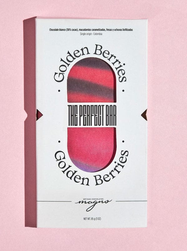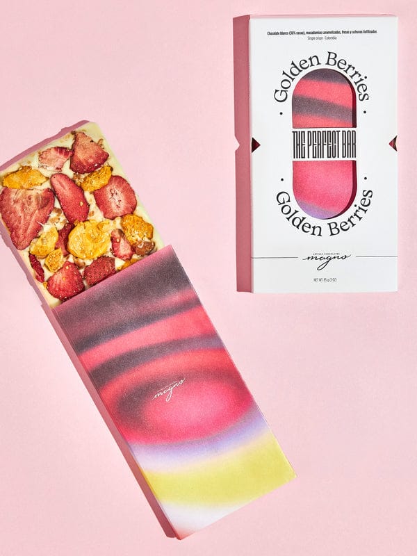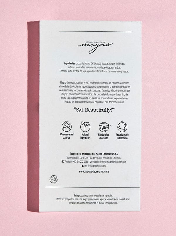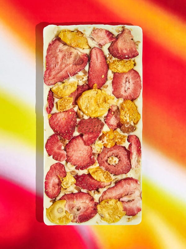 Barra de chocolate blanco con macadamias caramelizadas, fresas y uchuvas liofilizadas. Peso: 85 g.