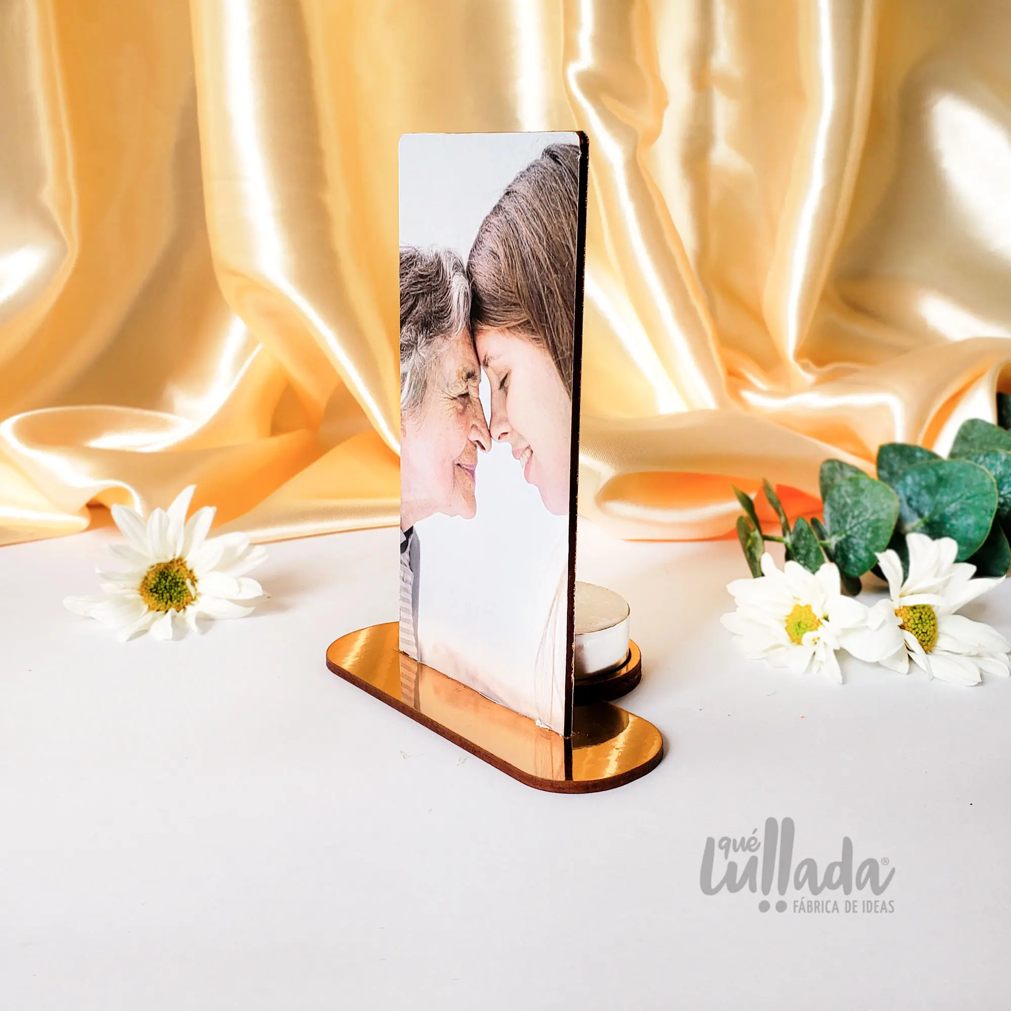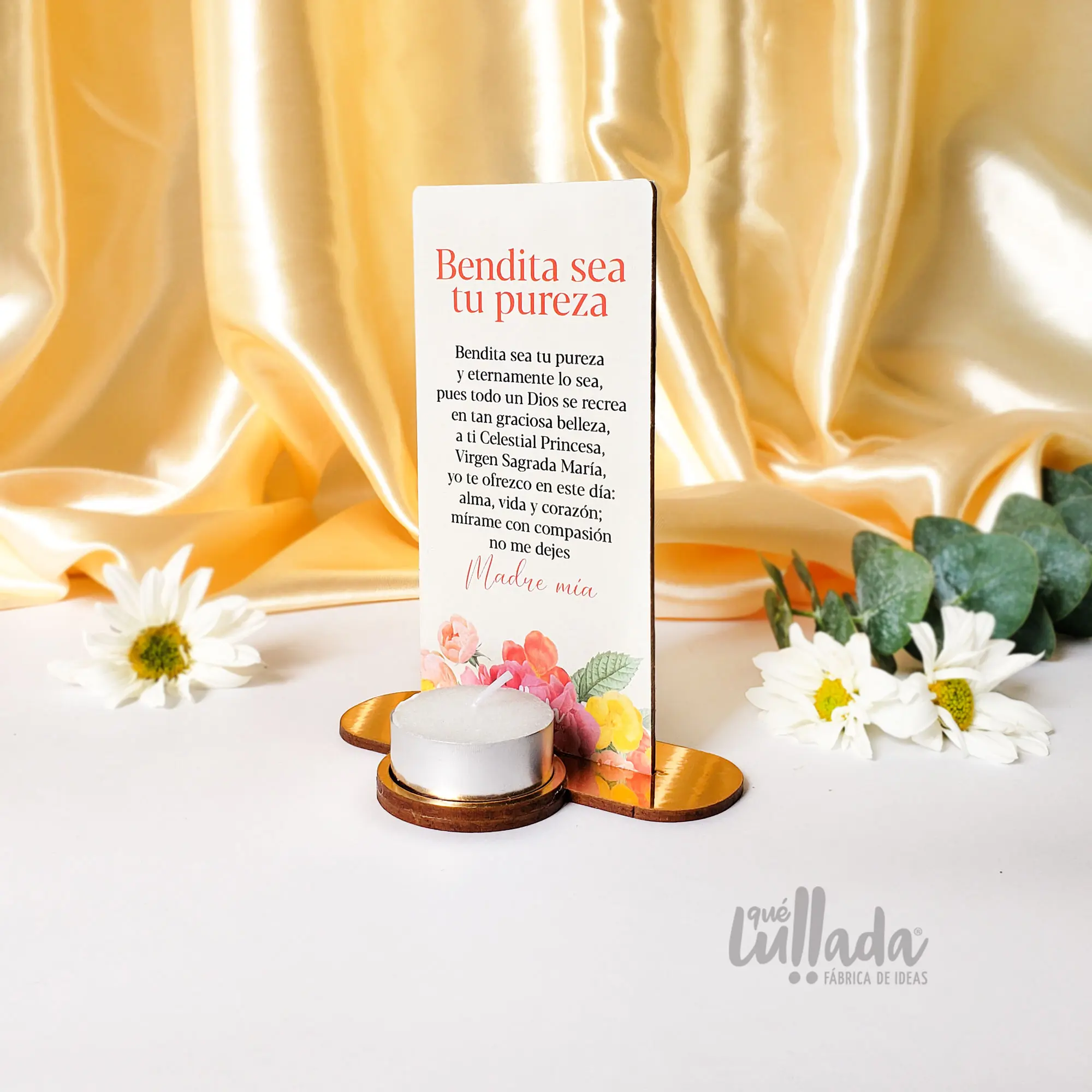 Incluye además, un soporte de madera con una vela, puedes personalizarlo con su oración favorita por un lado y por el otro lado con la foto favorita que elijas, es intercambiable. Regala este kit devocional a esa persona que es muy devota, fiel con su oración y creyente a los milagros y favores de la Virgen de Guadalupe.