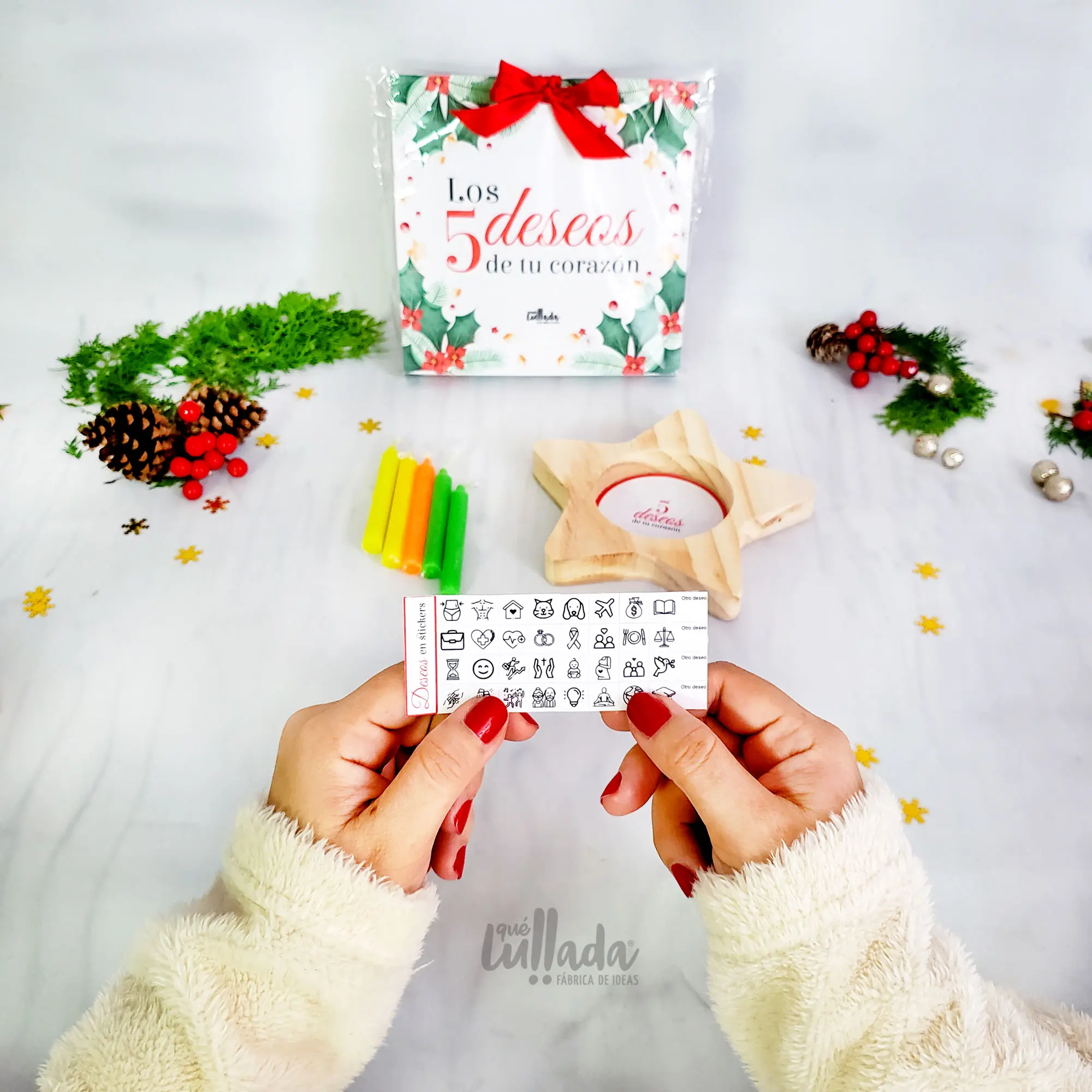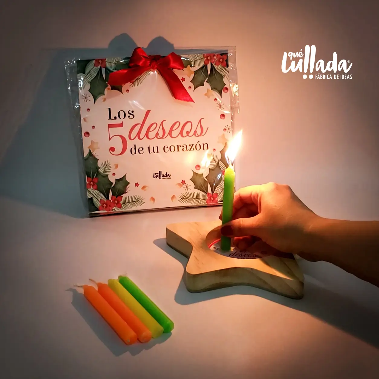 Con este Kit Día de las Velitas, ilumina como una estrella y enciende tus velitas pidiendo los 5 deseos más profundos de tu corazón. Este Kit es especial para no hacer regueros de cera y evitar quemaduras con la misma esperma, ya que se coloca cada vela dentro del círculo interior de la estrella de madera de pino; pero antes de ello, te enviamos unos stickers representados en los deseos más pedidos esta noche de velitas, para que elijas tus 5 favoritos y los pegues en el fondo de la estrella para que la luz de cada vela los ilumine y los haga realidad Elige tu combinación favorita y disfruta viendo cómo se consumen y se combinan los colores. ENVIO GRATIS a partir de 12 unidades!! Elige el color de velitas: -Color biche -Color pastel 12 - 35 $27.000 iva incluido 36 - 64 $25.000 iva incluido Este Kit día de las velitas contiene 5 velitas de color a elección, una estrella que está elaborada en pino canadiense y todo esto empacado en un estuche para que lo lleves a cualquier lado. El tamaño de la estrella es aproximadamente de 20 cm.