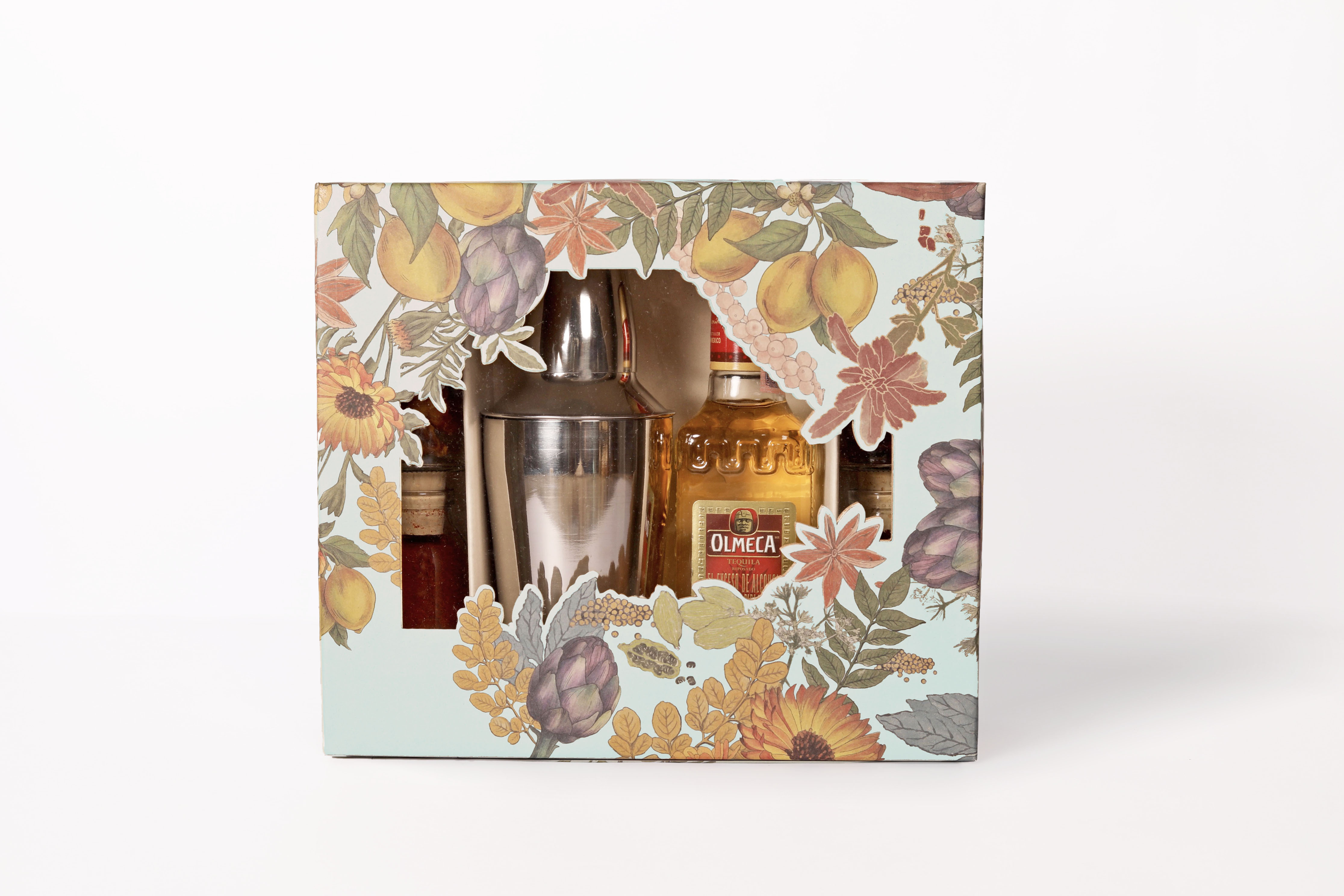 El kit incluye media botella de tequila Olmeca, flor de jamaica, piña deshidratada, pimentón ahumado, ají amarillo y una coctelera.