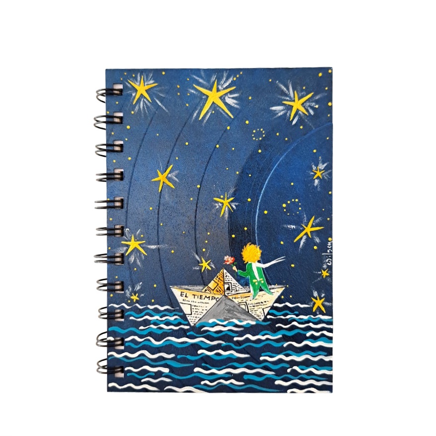 Libreta fabricada en un Disco de Vinilo (long play), el cual ha sido reutilizado y transformado para crear una pieza exclusiva y 100% pintada a Mano.