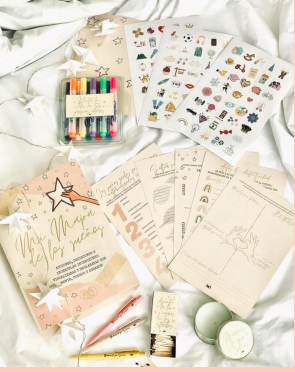 Contiene: Instrucciones, hojas con los 5 ejercicios y frases para desarrollar, 3 hojas de stickers, marcadores, vela, fósforos, esfero "Mereces lo que sueñas“ y pliego de visualización.