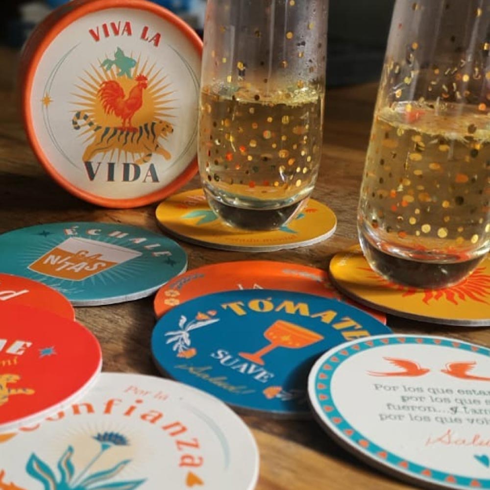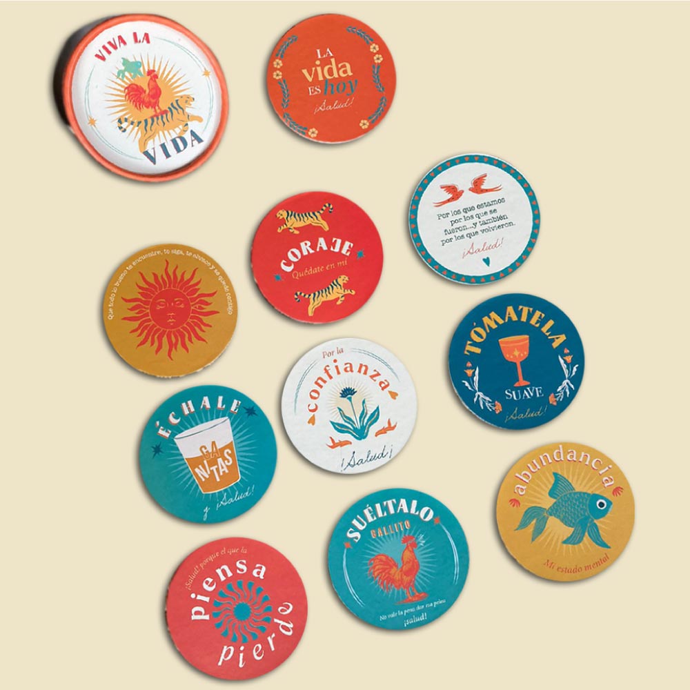 Juego de 10 portavasos de 9,5 cm, empacado en caja tubular de cartón para que tus celebraciones estén marcadas con mensajes que nos recuerden aprovechar ese momento que vivimos, que son esas pequeñas cosas las que nos hacen la vida feliz.