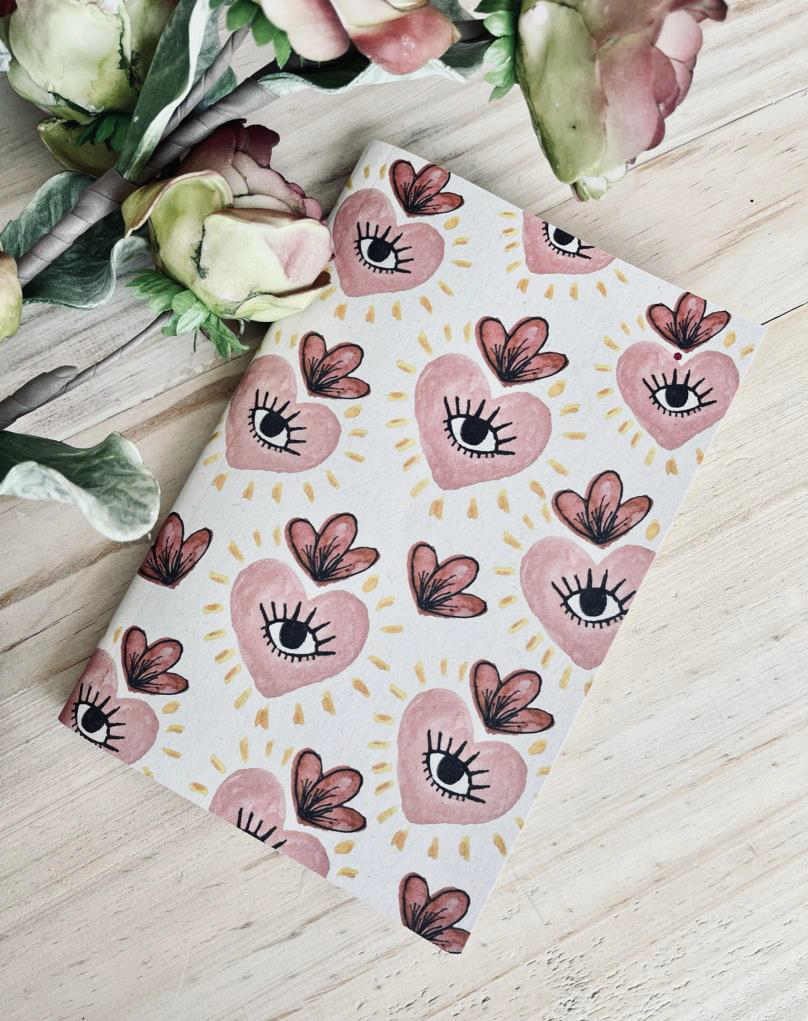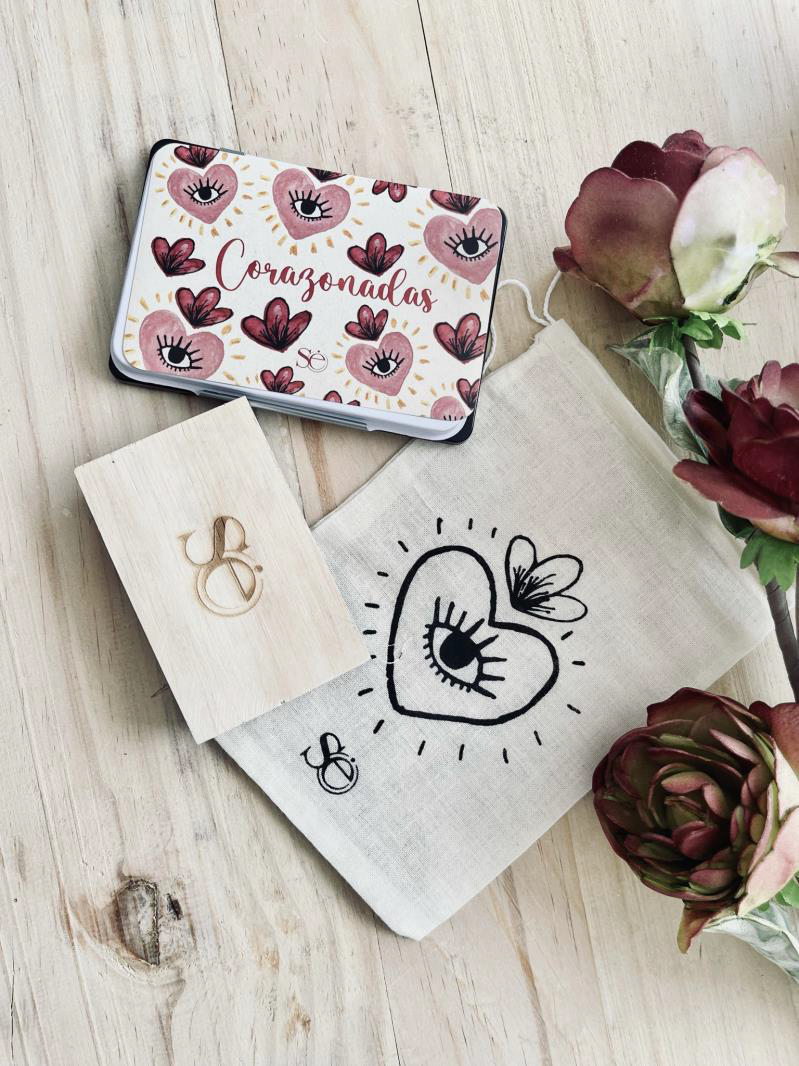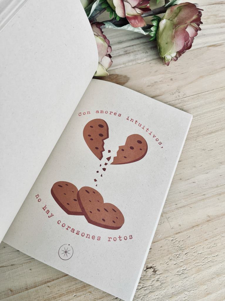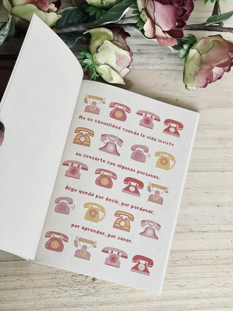 Libreta en papel ecológico con diferentes mensajes y espacios para escribir tus corazonadas diarias, sello “algo en mi me dice qué”, almohadilla de tinta negra,