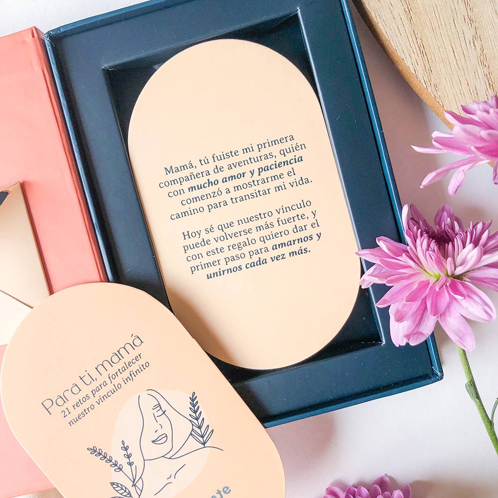 Regálale a mamá un detalle lleno de significado para crear nuevos recuerdos y hábitos de unión y bienestar. En este kit encontrarás retos para hacer junto a mamá, por ejemplo: - Mamá, cuéntame un momento que haya marcado tu niñez o juventud. Tu historia me llena de orgullo e inspiración. - Mamá, te diré 5 de las miles de razones que tengo para agradecerte. No quiero que pase un día más sin decirte gracias mamá. - Mamá, ¿me das un abrazo? Uno que quede por siempre marcado en nuestra memoria. Mi lugar más seguro es entre tus brazos mamá. - Tarjetas con 21 retos para vivir momentos inolvidables con mamá. - Un sobre con un mensaje sorpresa. Medidas: 10cm X 14,5cm Pasta dura. Cierre imantado
