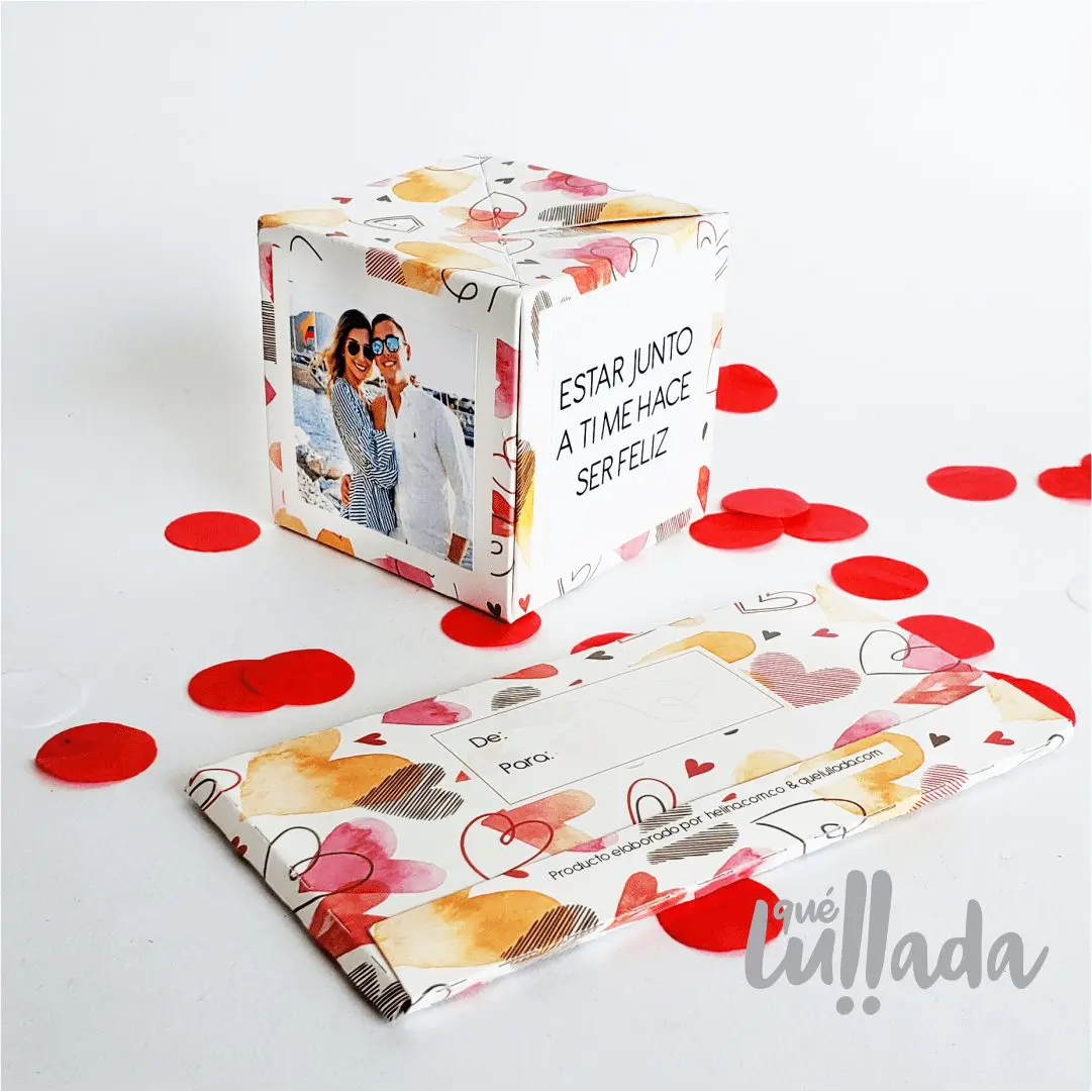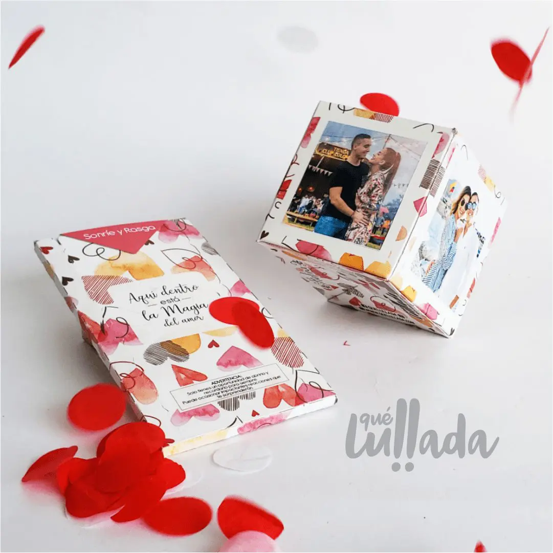 Sorprende y enamora con esta tarjeta que explota del amor con esta wujubox , una tarjeta explosiva !! Con esta WujubBox, no te quedará duda de los detalles duran para siempre y una imagen vale mas que mil palabras, porque esta tarjeta explosiva puedes sorprender a esa persona favorita con 3 de tus momentos más especiales y un mensaje sorpresa que quieras decirle y para siempre recordar. Personaliza tu tarjeta explosiva de esta forma: Agrega tus 3 fotos favoritas y un mensaje que irá dentro del cubo. En la tarjeta irá un espacio para escribir De/Para, lo marcaremos si deseas que lo hagamos por ti. Wujubox incluye: Un cubo personalizado, confeti sorpresa, dentro de una tarjeta lista para rasgar y una dosis extra de emoción!! Tamaño: El cubo mide 7.5 cm por cada lado.