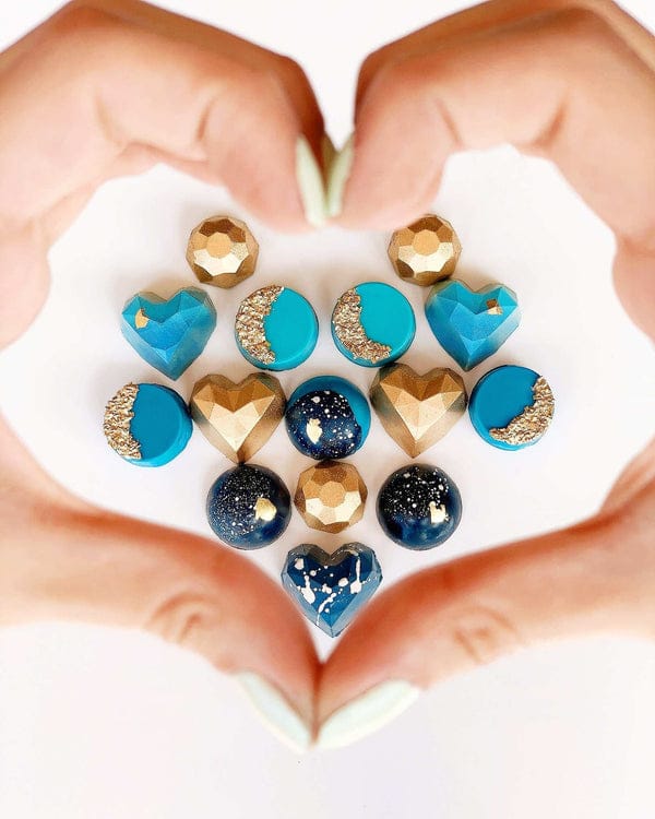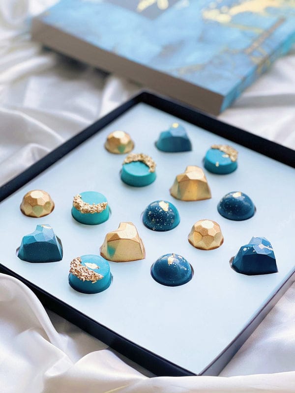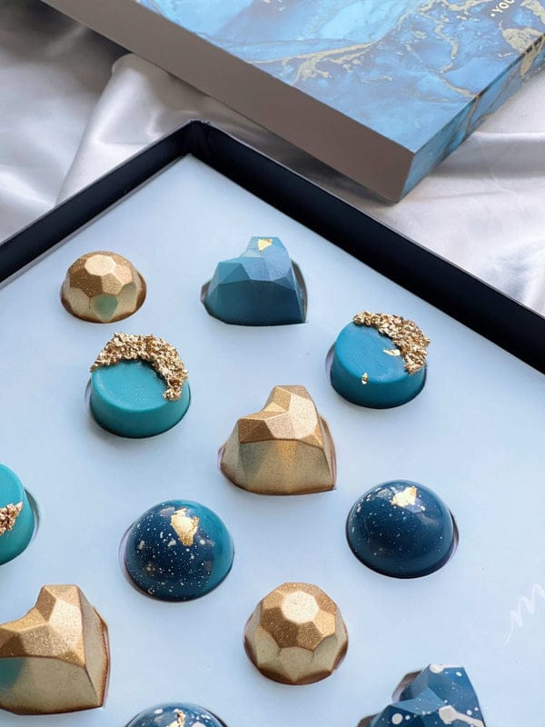 Gemas de chocolate decoradas con laminilla de oro de 24 K y pintadas a mano. Cada gema tiene un diseño único.