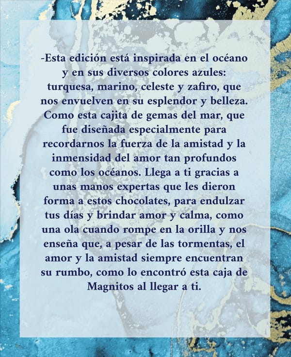 "Esta edición de Magno Chocolates está inspirada en el océano y en sus diversos colores azules: turquesa, marino, celeste y zafiro, que nos envuelven en su esplendor y belleza. Como esta cajita de gemas del mar, que fue diseñada especialmente para recordarnos la fuerza de la amistad y la inmensidad del amor tan profundos como los océanos. Llega a ti gracias a unas manos expertas que les dieron forma a estos chocolates, para endulzar tus días y brindar amor y calma, como una ola cuando rompe en la orilla y nos enseña que, a pesar de las tormentas, el amor y la amistad siempre encuentran su rumbo, como lo encontró esta caja de Magnitos al llegar a ti."